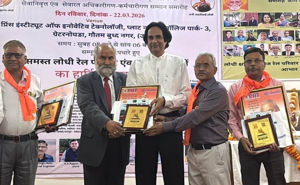 ग्रेटर नोएडा: लोधी क्षत्रिय समाज और लोधी क्षत्रिय रेल परिवार समिति द्वारा भारतीय रेलवे और मेट्रो रेलवे के सेवानिवृत्त एवं सेवारत अधिकारियों कर्मचारियों के सम्मान में एक भव्य समारोह का आयोजन किया गया. नॉलेज पार्क-3, ग्रेटर नोएडा स्थित प्रिंस इंस्टीट्यूट ऑफ इनोवेटिव टेक्नोलॉजी (PIIT) में आयोजित कार्यक्रम में 400 से अधिक लोधी क्षत्रिय समाज के प्राध्यापकों, शिक्षाविदों, अभियंताओं, चिकित्सकों, राजकीय जनसंरक्षकों, भारतीय रेलवे एवं मेट्रो रेलवे में सेवारत तथा सेवानिवृत्त अधिकारियों व कर्मचारियों को सम्मानित किया गया.