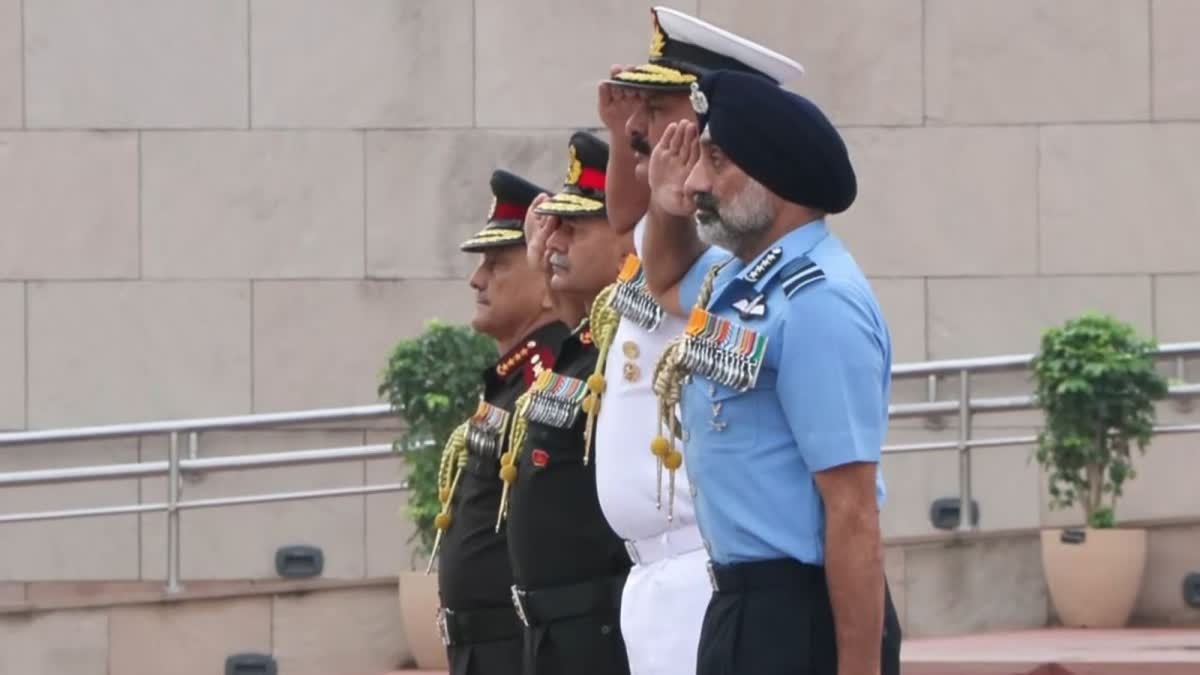 दिल्ली: चीफ ऑफ डिफेंस स्टाफ जनरल अनिल चौहान, वायुसेना प्रमुख एयर चीफ मार्शल एपी सिंह, सेना प्रमुख जनरल उपेंद्र द्विवेदी और नौसेना प्रमुख एडमिरल दिनेश के त्रिपाठी ने 93वें वायुसेना दिवस के अवसर पर राष्ट्रीय युद्ध स्मारक पर सैनिकों को श्रद्धांजलि अर्पित की.
