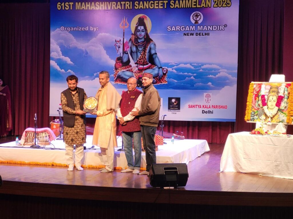 नई दिल्ली: दिल्ली के त्रिवेणी सभागार में 61 वें महाशिवरात्रि संगीत सम्मेलन का आयोजन हुआ, इसमें पं. मुकुल कुलकर्णी का गायन मंत्रमुग्ध करने वाला था. पं. मुकुल कुलकर्णी ने राग झिंझोटी और खमाज में दादरा गाया. इनके साथ तबले पर संगति पं. प्रदीप सरकार ने की। पं. देवेन्द्र वर्मा ने हारमोनियम पर रागदारी का निर्वाह करते हुए सुंदर प्रस्तुति की. पं. मुकुल कुलकर्णी को सरगम मंदिर के संस्थापक “पं. जगदीश मोहन सम्मान” से सम्मानित किया गया.