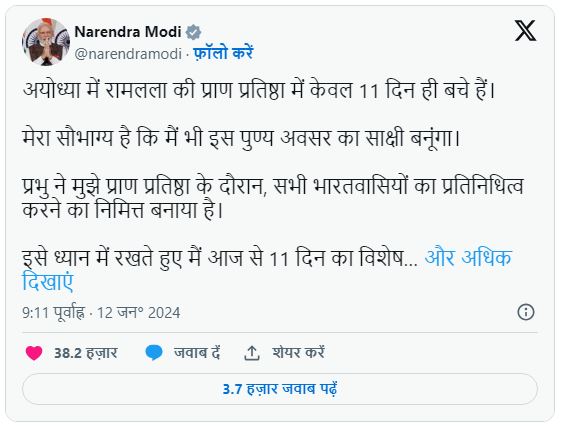 पीएम मोदी ने सोशल मीडिया मंच एक्स पर अपने संदेश में कहा, अयोध्या में रामलला की प्राण प्रतिष्ठा में केवल 11 दिन ही बचे हैं. मेरा सौभाग्य है कि मैं भी इस पुण्य अवसर का साक्षी बनूंगा. प्रभु ने मुझे प्राण प्रतिष्ठा के दौरान सभी भारतवासियों का प्रतिनिधित्व करने का निमित्त बनाया है. इसे ध्यान में रखते हुए मैं आज से 11 दिन का विशेष अनुष्ठान आरंभ कर रहा हूं. मैं आप सभी जनता-जनार्दन से आशीर्वाद का आकांक्षी हूं. इस समय अपनी भावनाओं को शब्दों में कह पाना बहुत मुश्किल है, लेकिन मैंने अपनी तरफ से एक प्रयास किया है.