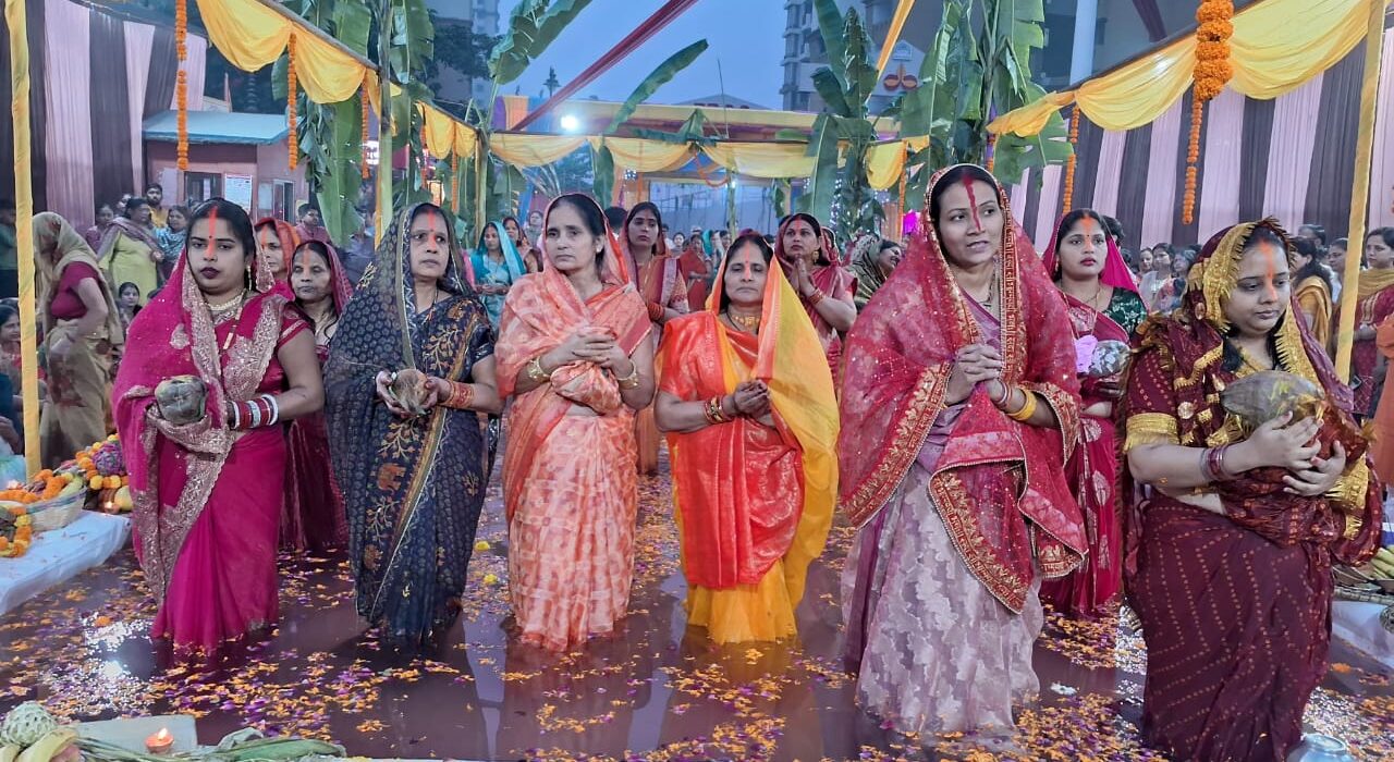 सोसायटी की महिलाएं पारंपरिक परिधान—पीली और लाल साड़ियाँ, माथे पर सिंदूर की लंबी रेखा और हाथों में टोकरी लिए, गीत गाती हुई घाट की ओर बढ़ रही थीं. पुरुष और बच्चे दीप सजाकर तालाब के चारों ओर व्यवस्था को संभाल रहे थे.