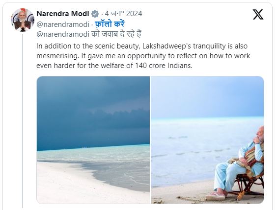 अपने लक्षद्वीप की कई तस्वीरें पीएम मोदी ने साझा की हैं. इस दौरान पीएम मोदी समंदर किनारे बैठे और समंदर किनारे टहलते भी नजर आ रहे हैं.एक अन्य तस्वीर में पीएम मोदी ब्लैक कर्ता पजामा पहने बीच पर टहलते नजर आ रहे हैं. उन्होंने एक्स पर लिखा कि सुबह-सुबह बीच पर टहलना आनंद के क्षण थे.