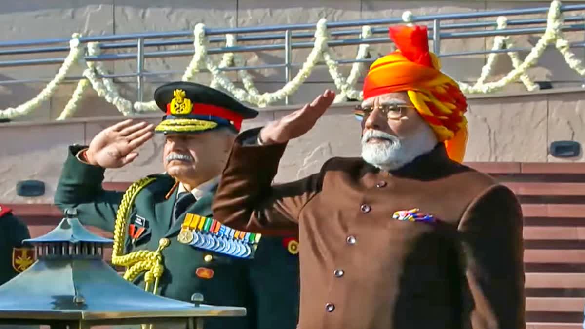 प्रधानमंत्री ने अपनी पगड़ी के साथ सफेद कुर्ता-पायजामा और भूरे रंग की बंदगला जैकेट और पॉकेट स्क्वायर के साथ पहना. प्रधानमंत्री नरेंद्र मोदी की पोशाक पहली बार तब सामने आई जब वे देश के लिए अपने प्राणों की आहुति देने वालों को श्रद्धांजलि देने के लिए राष्ट्रीय युद्ध स्मारक पहुंचे.