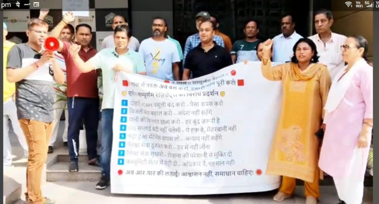 ग्रेटर नोएडा: ग्रेनो वेस्ट की इरोज़ सम्पूर्णम सोसायटी के लोगों द्वारा वी.सी.ए.एम. (VCAM) चार्जेज का अनुचित वसूली, डी.जी. बिजली की किल्लत, पानी की गंभीर समस्या, इरोस प्रबंधन द्वारा अत्यंत खराब मेंटेनेंस सेवाओं को लेकर अपना प्रदर्शन जारी रखा.