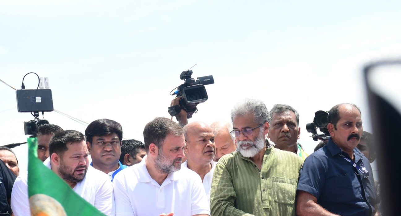 राजद नेता तेजस्वी यादव, लोकसभा नेता प्रतिपक्ष और कांग्रेस सांसद राहुल गांधी, भाकपा महासचिव डी राजा, भारतीय कम्युनिस्ट पार्टी (मार्क्सवादी-लेनिनवादी) लिबरेशन के नेता दीपांकर भट्टाचार्य और बिहार कांग्रेस अध्यक्ष राजेश राम राज्य विधानसभा चुनाव 2025 से पहले बिहार में मतदाता सूची के विशेष गहन पुनरीक्षण (एसआईआर) के खिलाफ महागठबंधन द्वारा बुलाए गए ‘बिहार बंद’ विरोध प्रदर्शन में शामिल हुए.