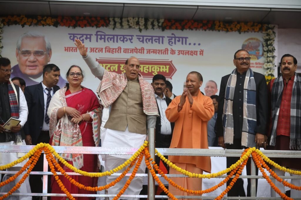 उत्तर प्रदेश: भारत रत्न अटल बिहारी वाजपेयी जी के जन्म शताब्दी वर्ष के उपलक्ष्य में आयोजित अटल युवा महाकुंभ के उद्घाटन समारोह को संबोधित करते हुए रक्षा मंत्री राजनाथ सिंह ने अटल जी के अद्वितीय व्यक्तित्व और उनके साथ जुड़ी स्मृतियों को साझा किया. इस अवसर पर उन्होंने अटल जी की महानता का स्मरण करते हुए प्रदेश के विकास में मुख्यमंत्री योगी आदित्यनाथ के प्रयासों की प्रशंसा की. उन्होंने कहा कि अटल जी का जीवन और विचारधारा आज भी प्रेरणा के स्रोत हैं.