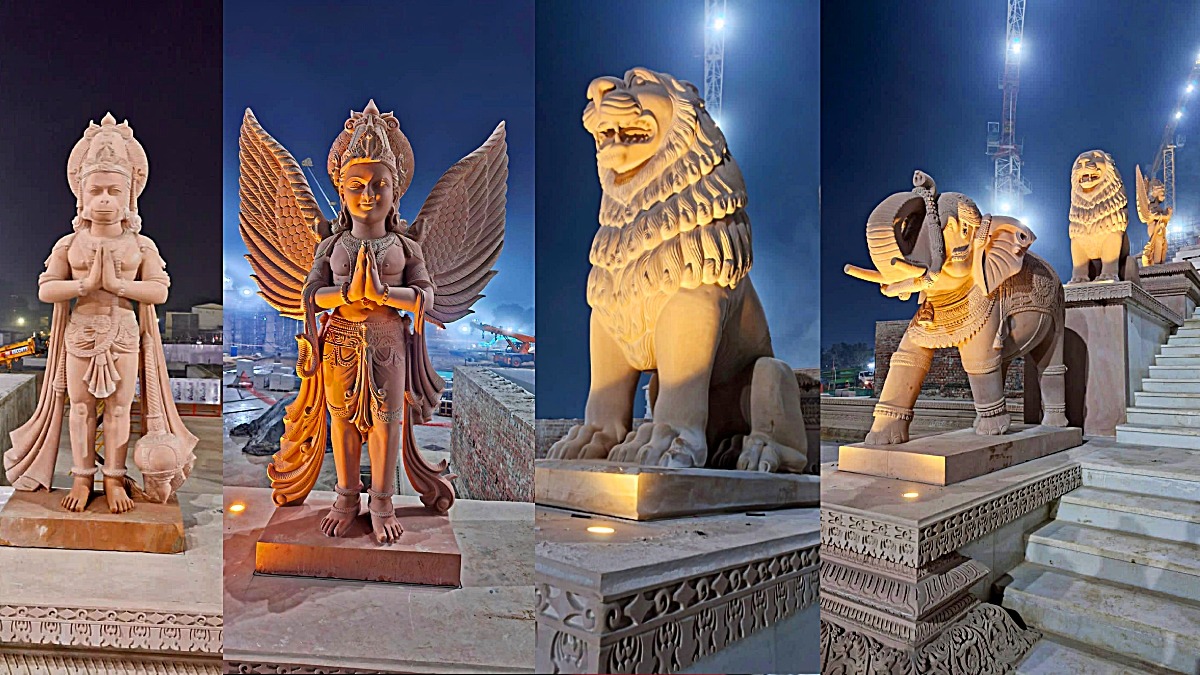 उत्तर प्रदेश: श्रीराम जन्मभूमि मंदिर में रामलला की प्राण-प्रतिष्ठा 22 जनवरी को होगी. उससे पहले गुरुवार शाम को श्रीराम जन्मभूमि तीर्थ क्षेत्र ट्रस्ट ने मंदिर के प्रवेश द्वार की कुछ तस्वीरें शेयर की है. ट्रस्ट ने बताया है कि प्रवेश द्वार पर चार मूर्तियों को स्थापित किया गया है. ट्रस्ट ने बताया कि श्रीराम जन्मभूमि मंदिर के प्रवेश द्वार पर आज गज (हाथी), सिंह, हनुमान जी और गरुड़ जी की मूर्तियां स्थापित की गईं हैं. ये सभी मूर्तियां राजस्थान के ग्राम बंसी पहाड़पुर के हल्के गुलाबी रंग के बलुआ पत्थर से बनी हैं.