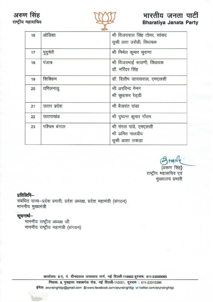 बीजेपी के ओर से शनिवार को जारी की गई सूची में उत्तर प्रदेश के अलावा उत्तराखंड के प्रभारी की जिम्मेदारी दुष्यंत गौतम को सौंपी गई है. बीजेपी के राष्ट्रीय महासचिव अरुण सिंह के ओर से 23 राज्यों के प्रभारी की लिस्ट जारी की गई है. इसमें लिखा है, बीजेपी के राष्ट्रीय अध्यक्ष जगत प्रकाश नड्डा ने आगामी लोकसभा चुनाव के लिए राज्यों के चुनाव प्रभारी और सह-प्रभारी की नियुक्ति की है.