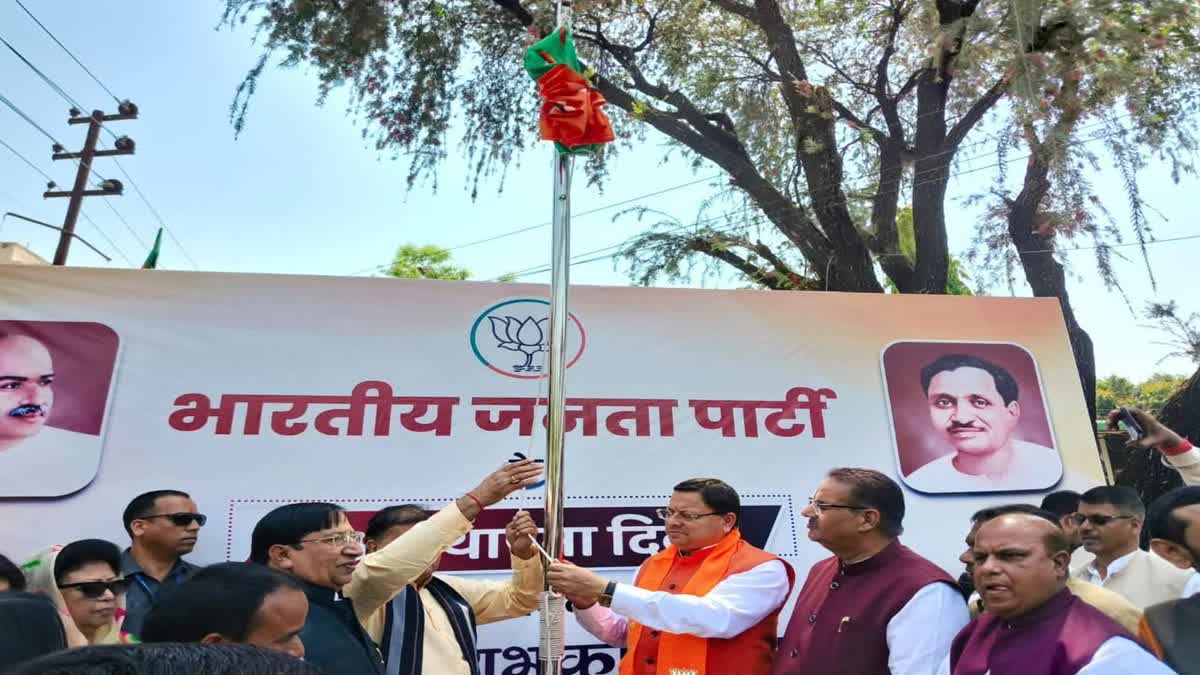 आज भारतीय जनता पार्टी के स्थापना दिवस के अवसर पर भाजपा प्रदेश कार्यालय, देहरादून में मुख्यमंत्री श्री @pushkardhami जी एवं प्रदेश अध्यक्ष व राज्यसभा सांसद श्री @mahendrabhatbjp जी ने पार्टी के वरिष्ठ पदाधिकारियों एवं कार्यकर्ताओं के साथ ध्वजारोहण किया।#BJP4ViksitBharat pic.twitter.com/k1jpeWLagq