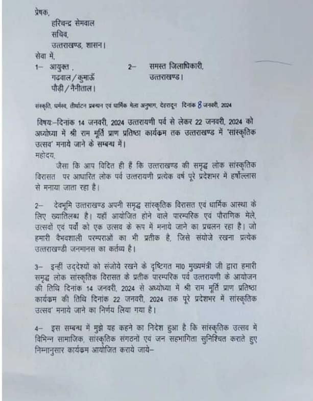 सीएम धामी के निर्देश अनुसार संस्कृति एवं धर्मस्व विभाग ने प्रदेश भर में सांस्कृतिक उत्सव का निर्णय लिया है. इस संबंध में संस्कृति एवं धर्मस्व सचिव हरिचंद्र सेमवाल ने गढ़वाल और कुमाऊं मंडल आयुक्त को आदेश जारी किए.14 जनवरी को मनाए जाने वाले उत्तरायणी पर्व से 22 जनवरी तक अयोध्या में श्रीराम मूर्ति की प्राण प्रतिष्ठा कार्यक्रम तक उत्सव मनाया जाएगा. जिला व ब्लाक स्तर पर महिला और युवक मंगल दल, स्वयं सहायता समूहों समेत आम लोगों की सहभागिता से कलश यात्रा और झांकी निकाली जाएगी.