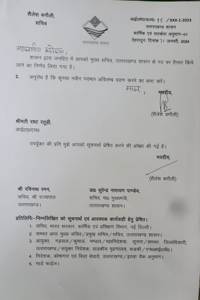 1988 बैच की आईएएस अधिकारी व वर्तमान में अपर मुख्य सचिव राधा रतूड़ी की छवि एक कुशल प्रशासक और ईमानदार असफर के रूप में की जाती है. प्रदेश में महिला सशक्तिकरण को निरंतर बढ़ावा देने की पहल में आईएएस राधा रतूड़ी को मुख्य सचिव की कमान सौंपी है. इससे सरकार ने अपने इस कदम से महिला सशक्तिकरण का संदेश भी दिया है.