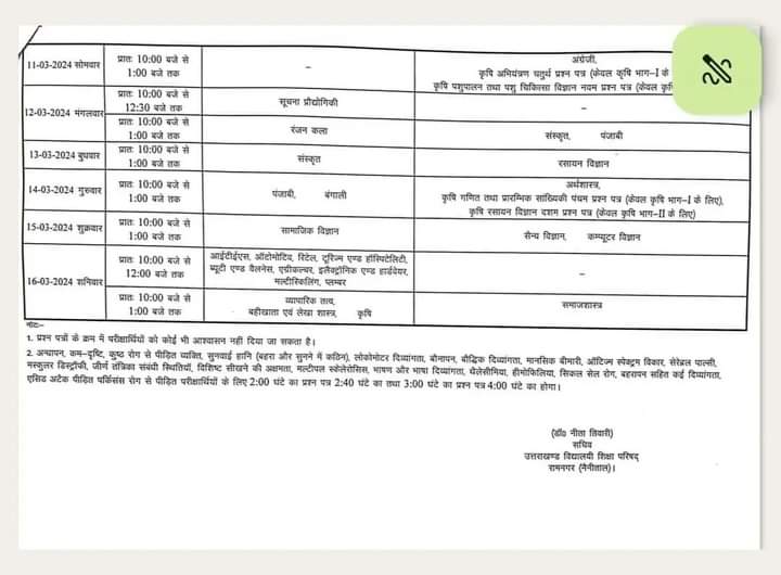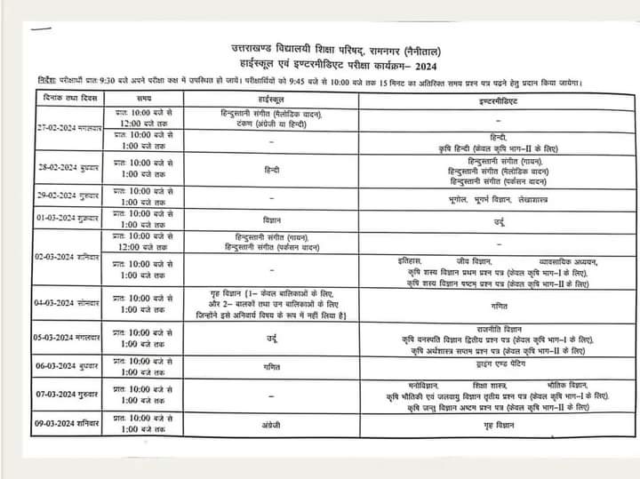 बैठक में परीक्षा समिति की ओर से निर्णय लिया गया कि उत्तराखंड विद्यालयी शिक्षा परिषद रामनगर, नैनीताल की ओर से संचालित हाईस्कूल और इंटरमीडिएट परीक्षा दिनांक 27 फरवरी 2024 से शुरू होगी, जो 16 मार्च 2024 तक चलेगी. हाईस्कूल और इंटरमीडिएट परीक्षा 27 फरवरी से शुरू होंगी, जो 16 मार्च तक चलेगी.
