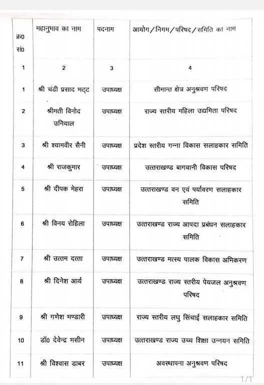 जारी सूची के अनुसार चंडी प्रसाद भट्ट को सीमांत क्षेत्र अनुश्रवण परिषद का उपाध्यक्ष, विनोद उनियाल को राज्य स्तरीय महिला उद्यमिता परिषद का उपाध्यक्ष व श्यामवीर सैनी को प्रदेश स्तरीय गन्ना विकास सलाहकार समिति का उपाध्यक्ष बनाया गया है.