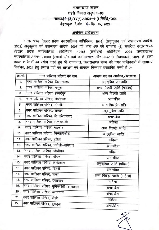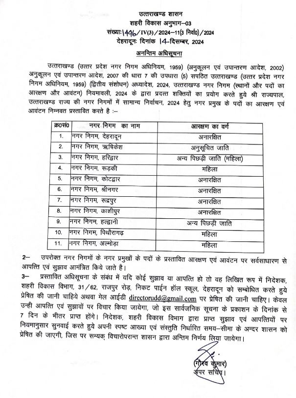 उत्तराखंड: निकाय चुनावों को लेकर अब अंतिम दौर का कार्य चल रहा है. शहरी विकास द्वारा नगर निकाय चुनाव के लिए आरक्षण को मंजूरी दे दी गई. शहरी विकास निदेशालय द्वारा जारी किए गए आदेशों में नगर पालिका, नगर पंचायत और नगर निगम के लिए अधिसूचना जारी की गई है. वहीं, निदेशालय ने वार्ड के आरक्षणों की भी समय सारणी भी जारी कर दिया है.