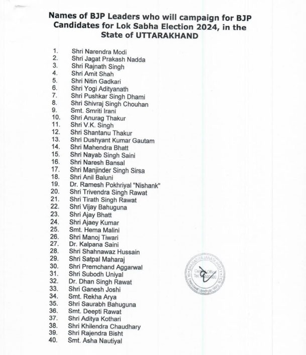 उत्तराखंड: पहले चरण में होने जा रहे लोकसभा चुनावों को देखते हुए बीजेपी ने अपनी तैयारियां जोरों पर कर दी है. उत्तराखंड बीजेपी ने अपने स्टार प्रचारकों की सूची जारी करी है जिसमें पीएम मोदी, यूपी सीएम योगी सहित 40 दिग्‍गजों के नाम शामिल हैं. सूची सामने आने के बाद उत्तराखंड की राजनीती में हलचल तेज़ हो गई है. वहीं सूची में शामिल बड़े बड़े केंद्रीय नेताओं के नामों को देखते हुए यह साफ़ कहा जा सकता है की इस बार बीजेपी उत्तराखंड की जनता को अपने पक्ष में करने के लिए दिन रात की मेहनत में लगी हुई है.